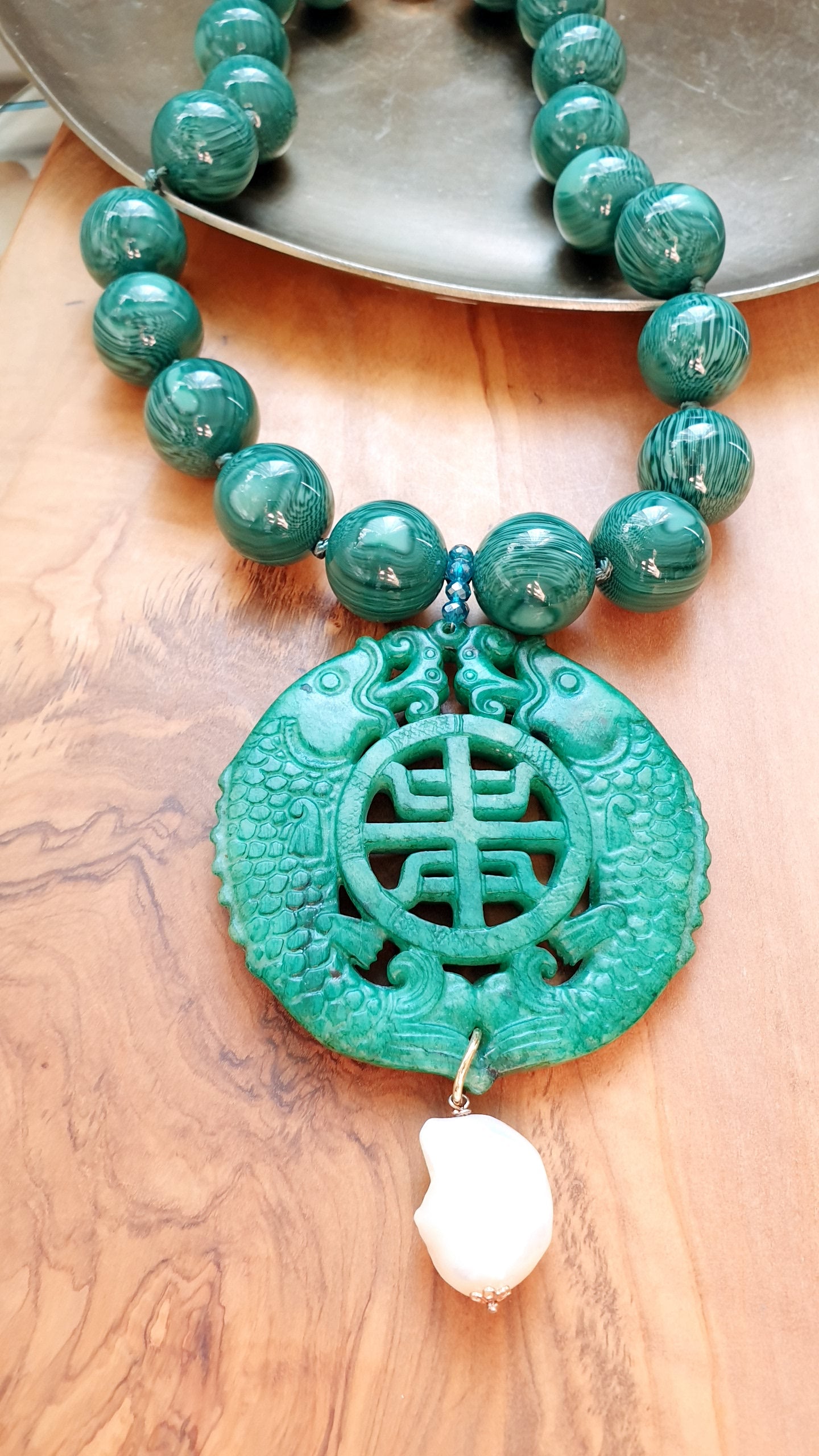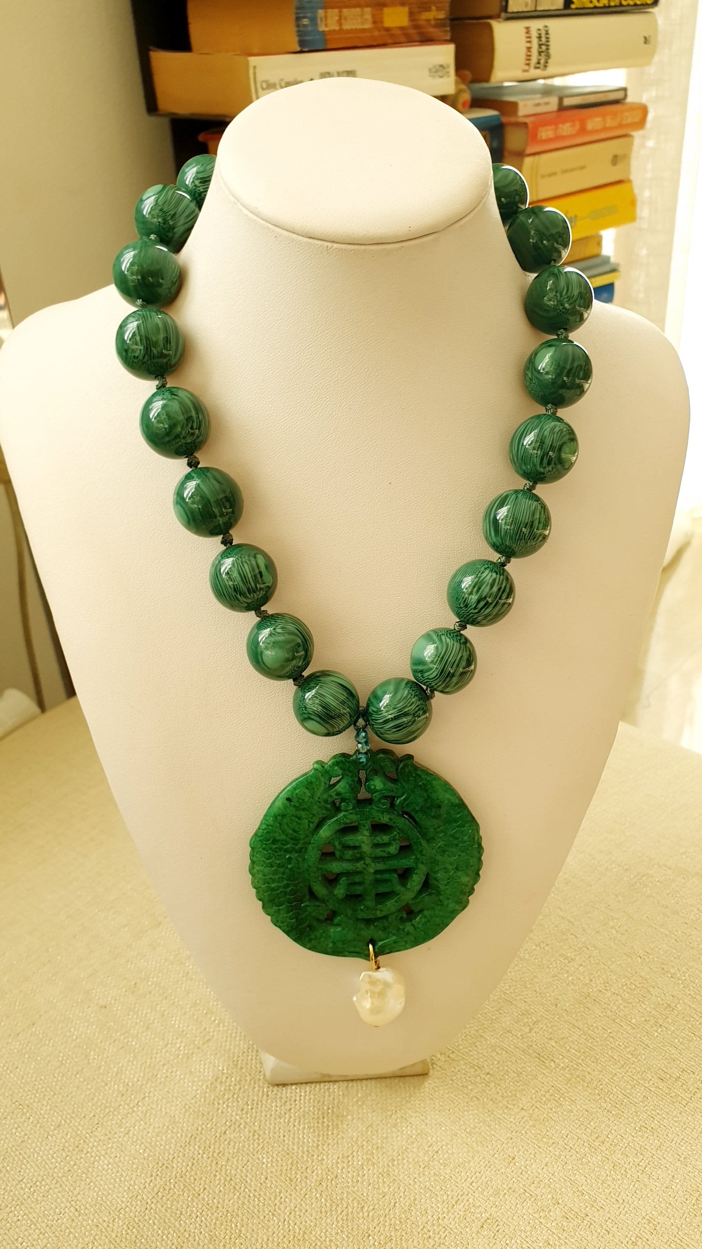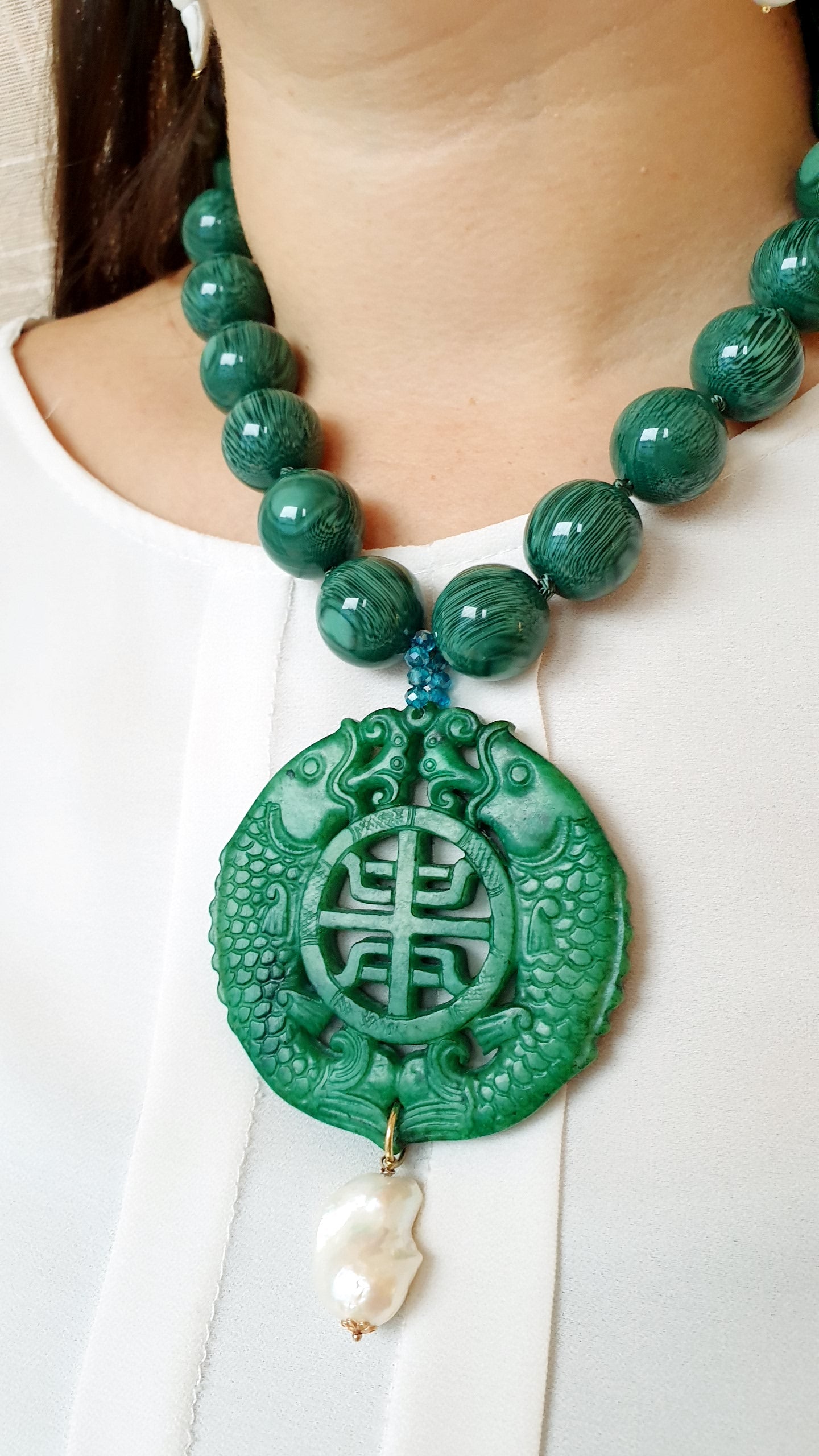 Grande giada intagliata verde cm. 7, perla barocca bianchissima cm. 2 x 1.5