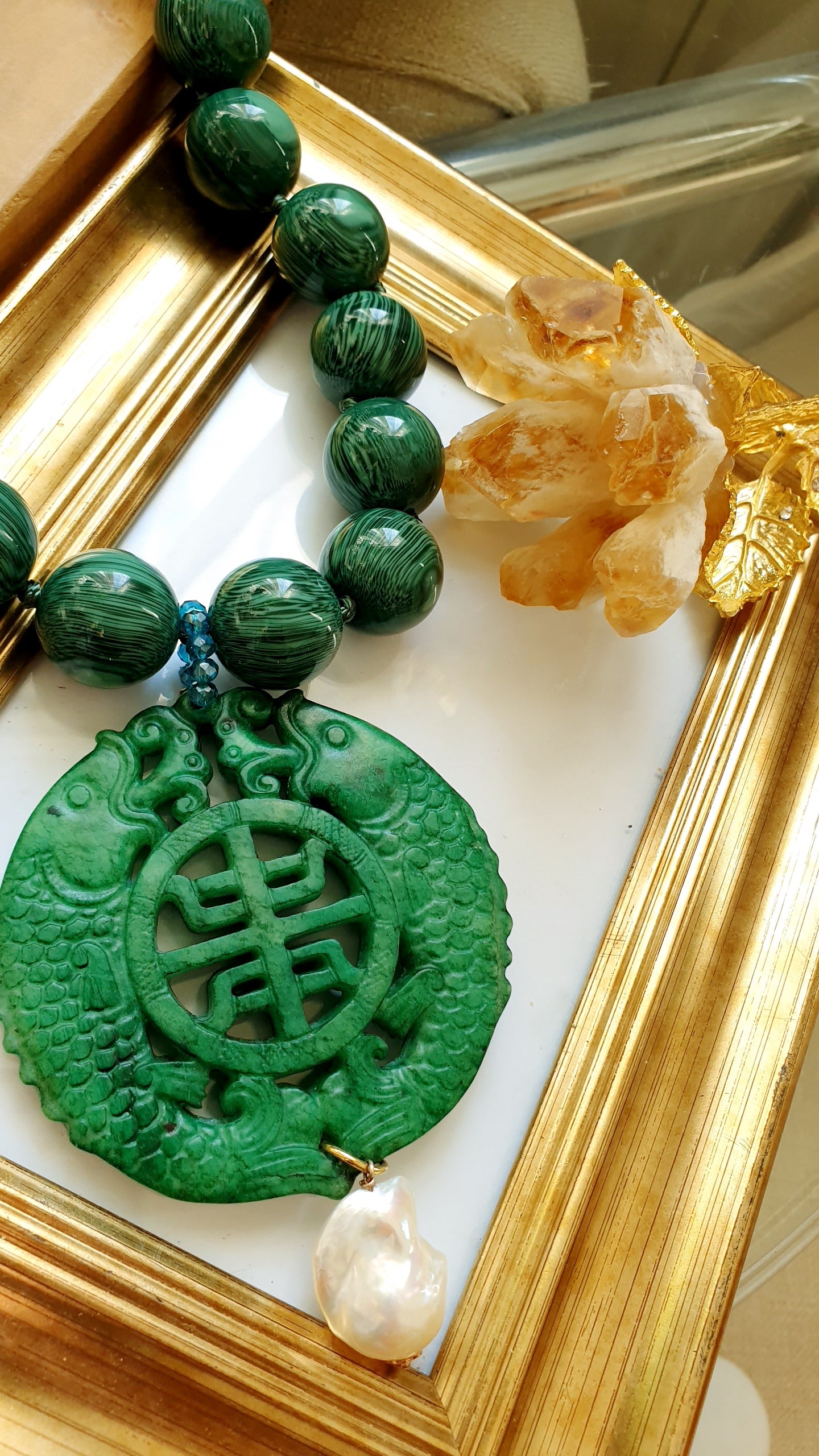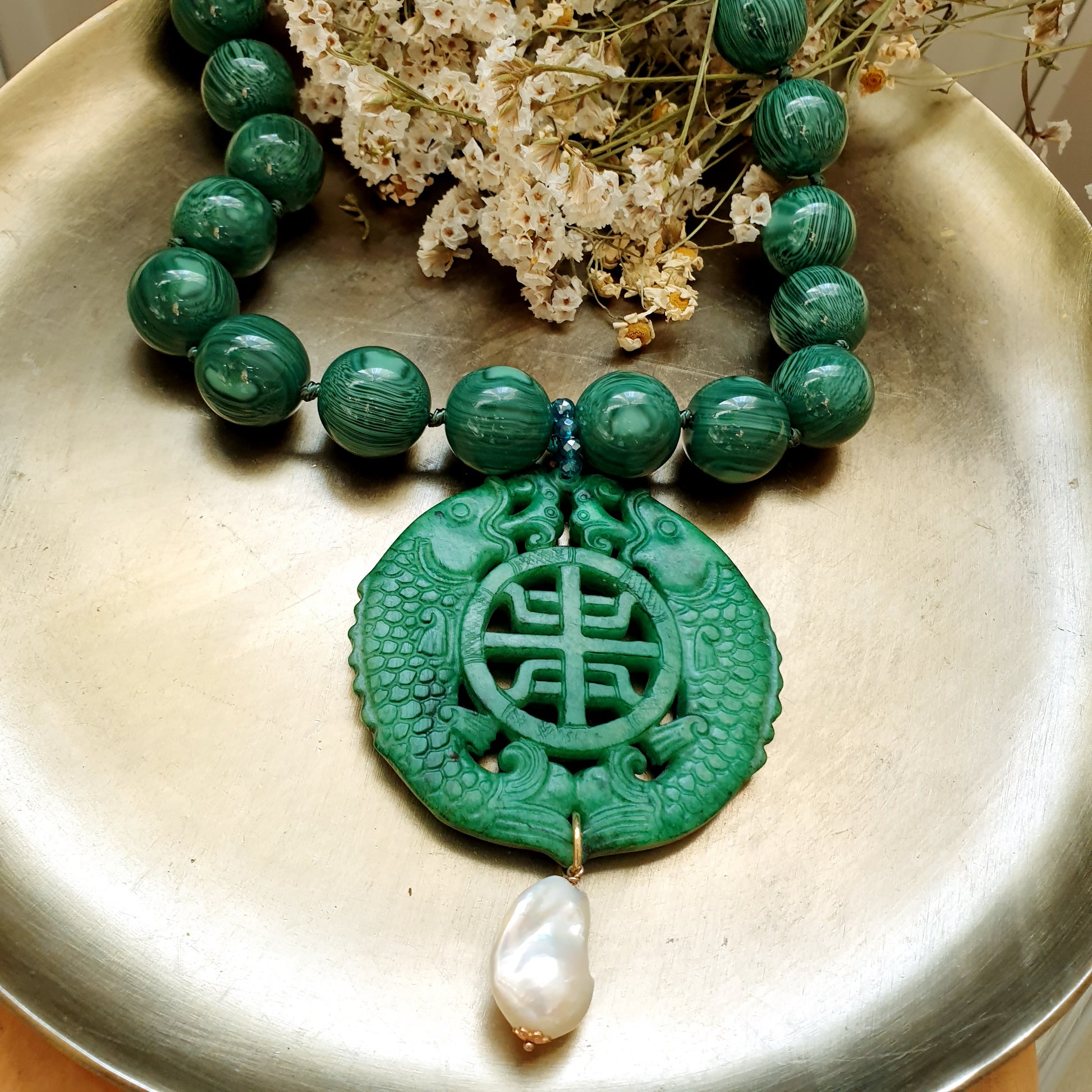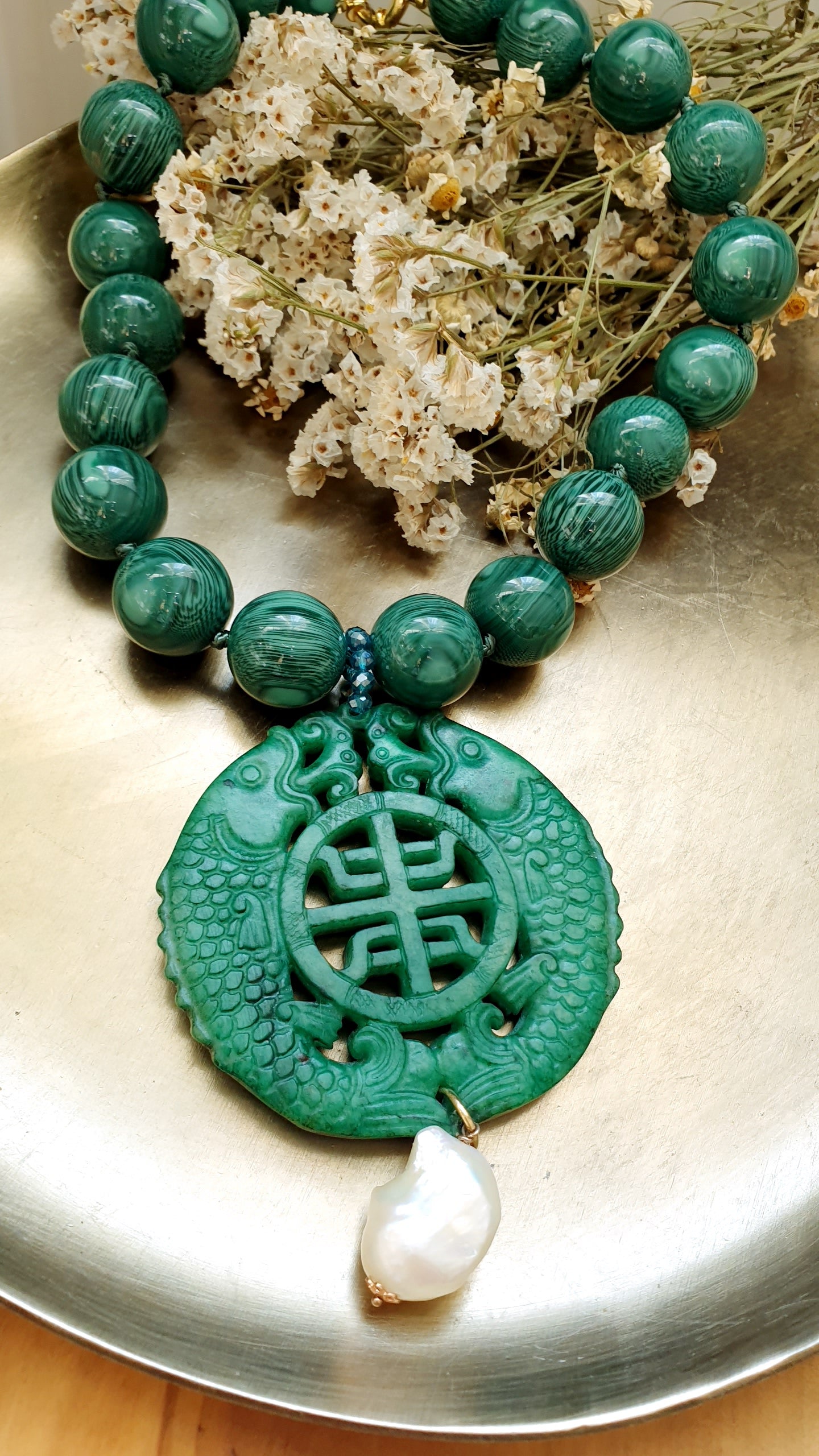 Grande giada intagliata verde cm. 7, perla barocca bianchissima cm. 2 x 1.5