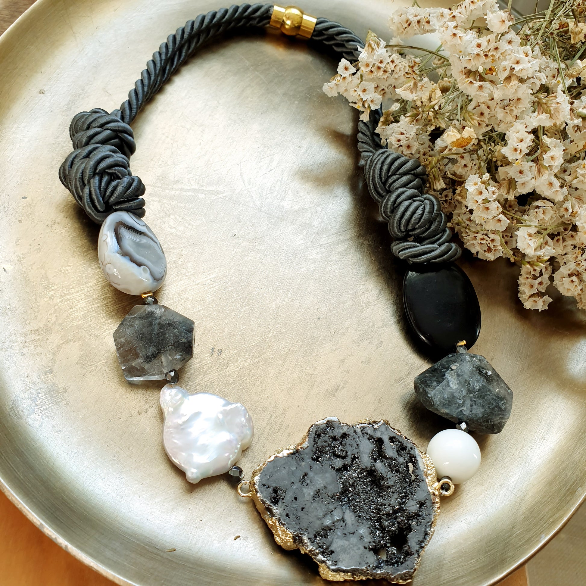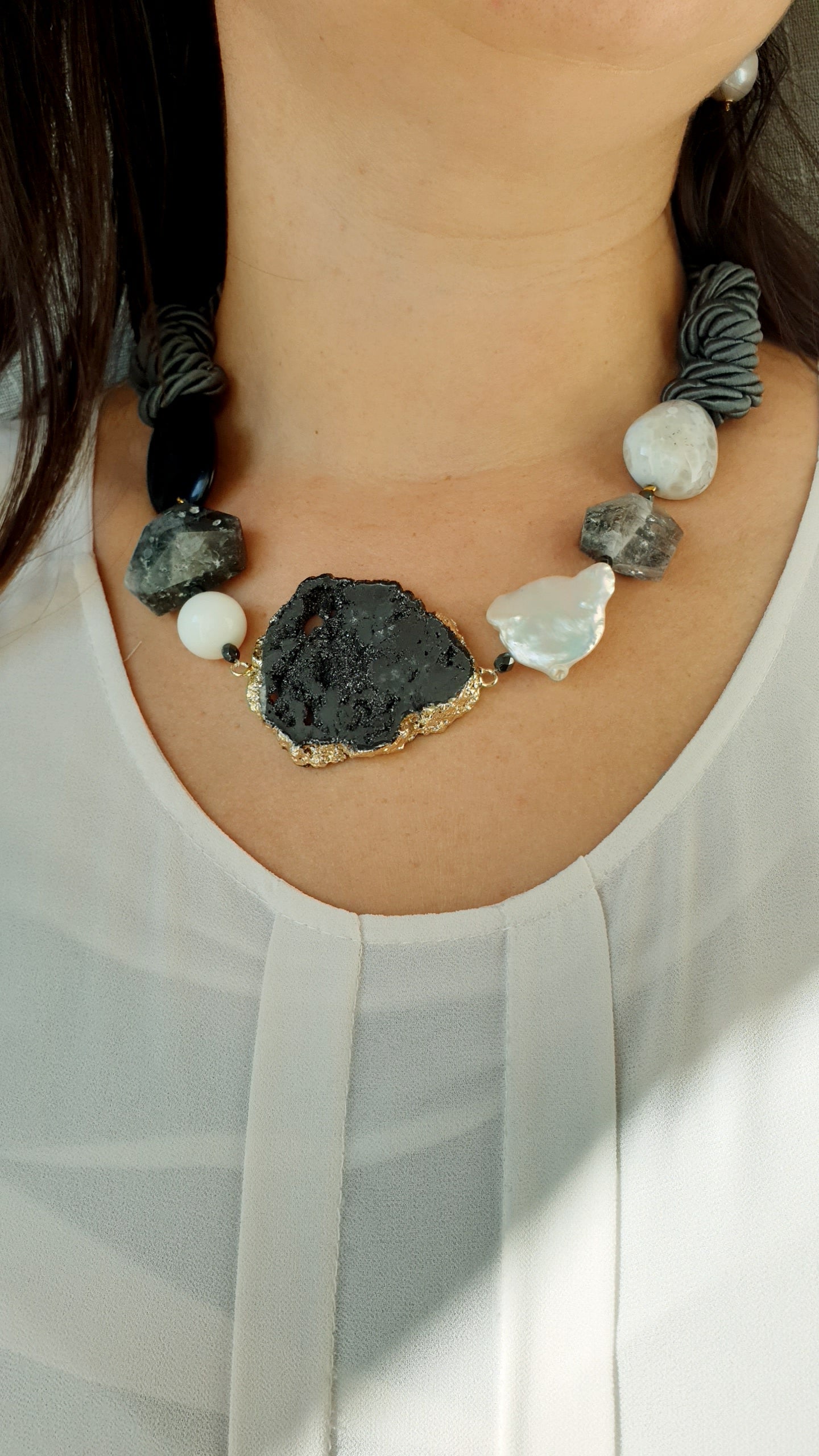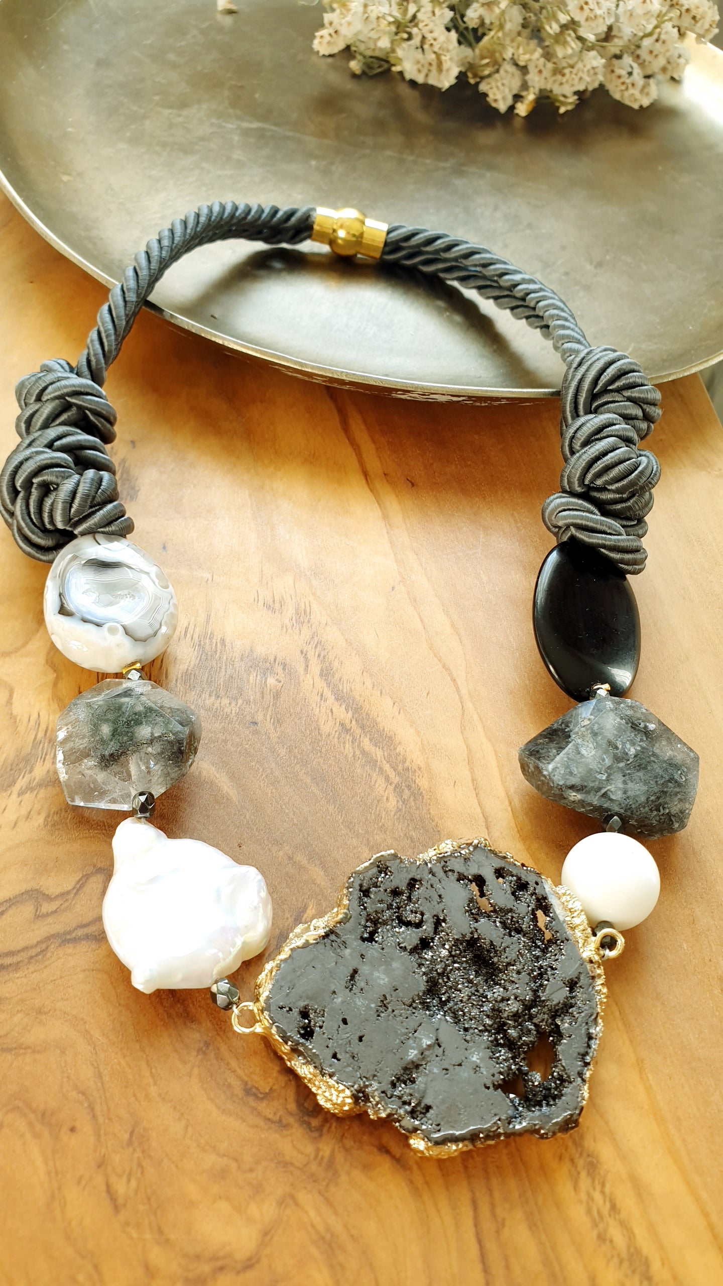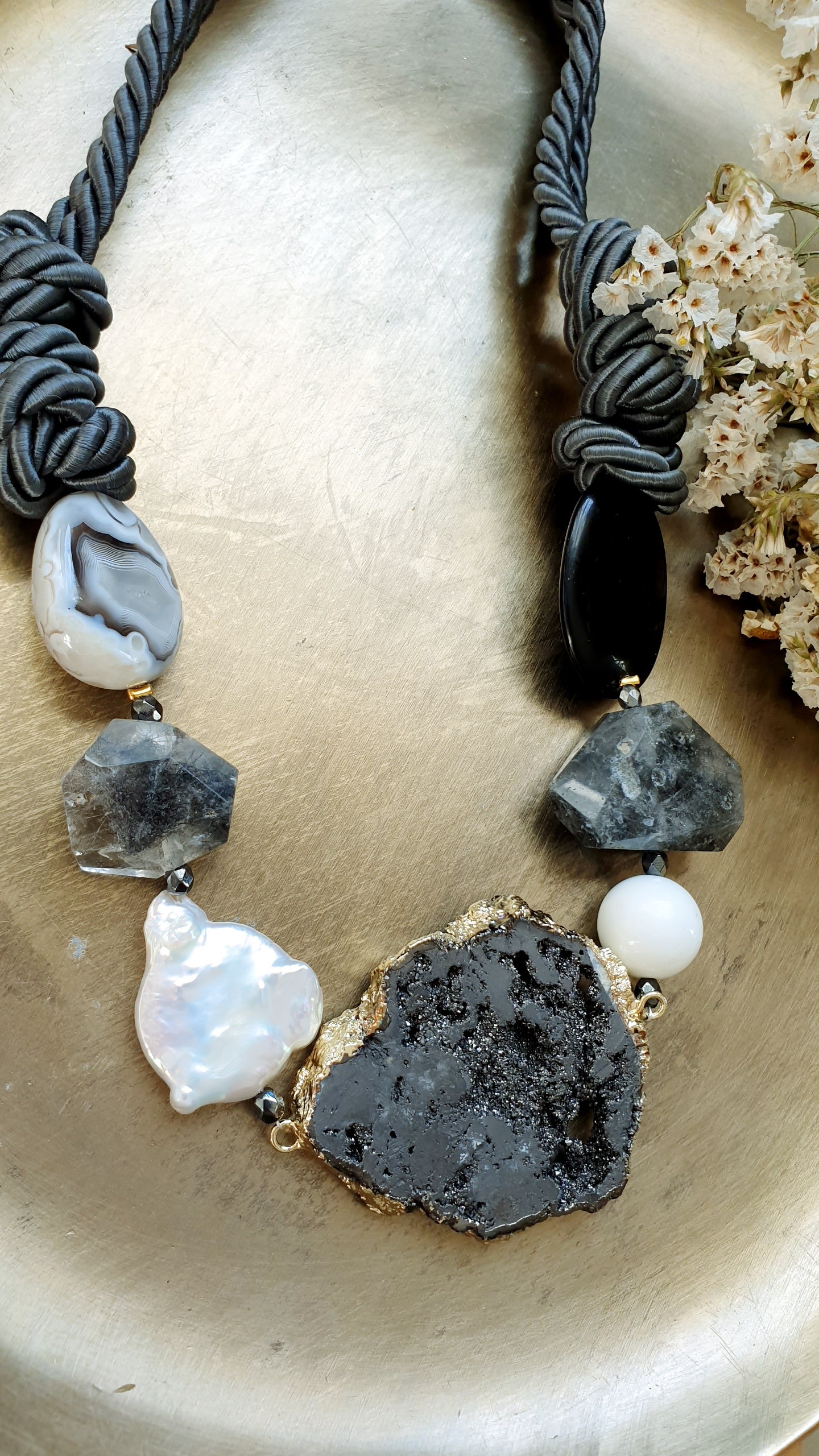 Girocollo in seta con drusa di agat, quarzo tormalinato, perla, onice