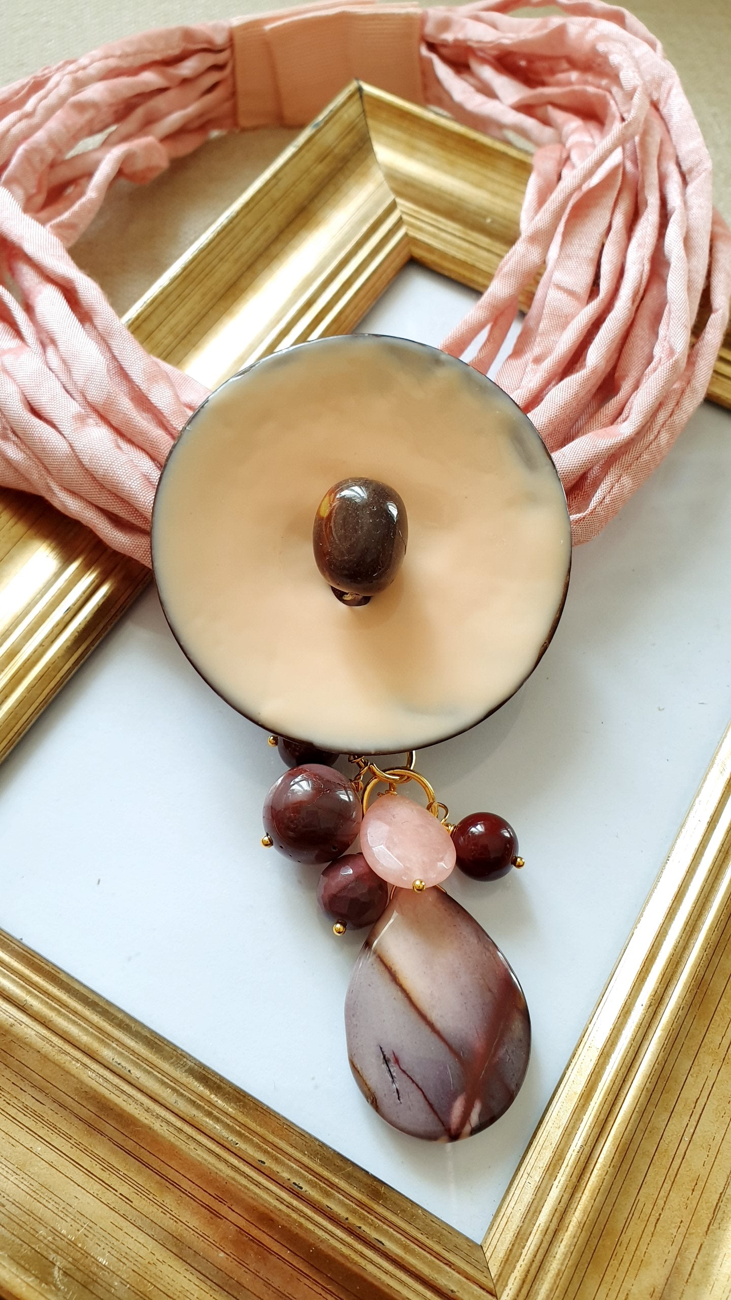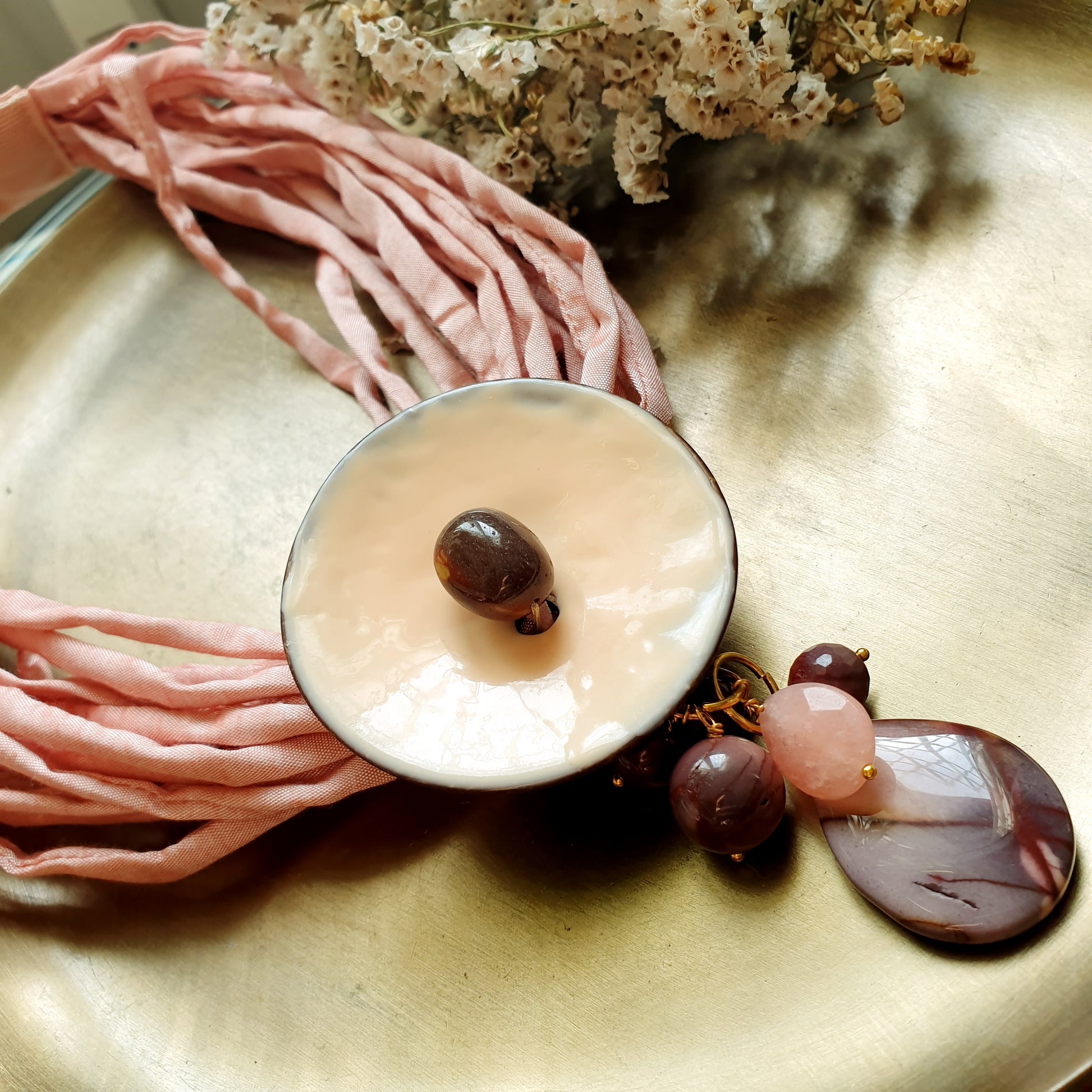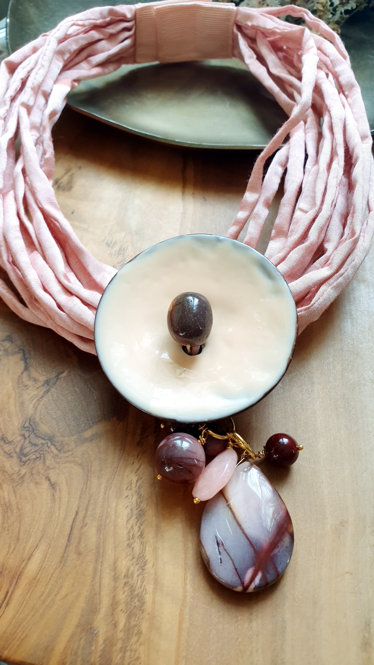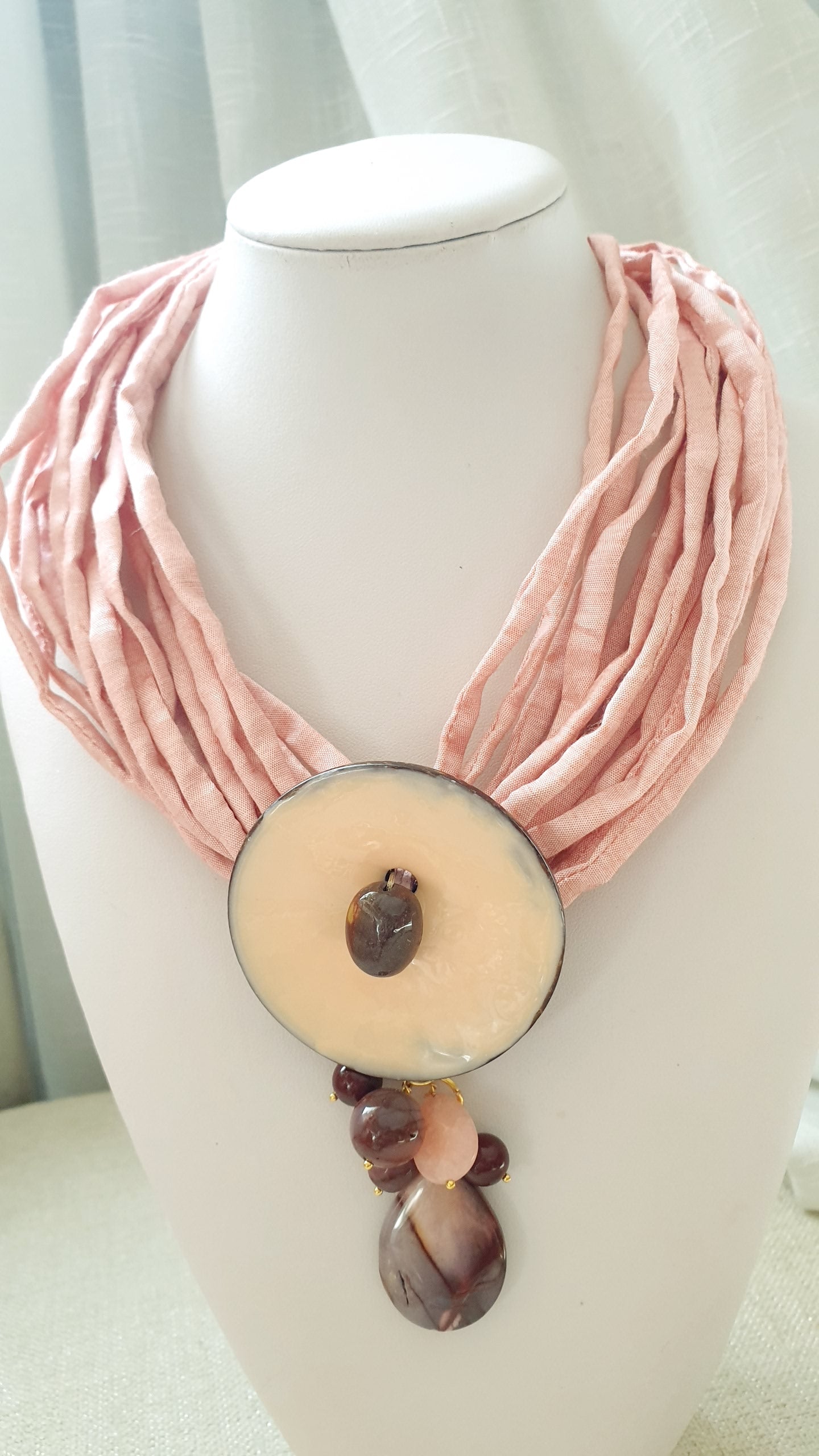 Collana artigianale realizzata con girocollo multifilo in stoffa rosa e chiusura con velcro.