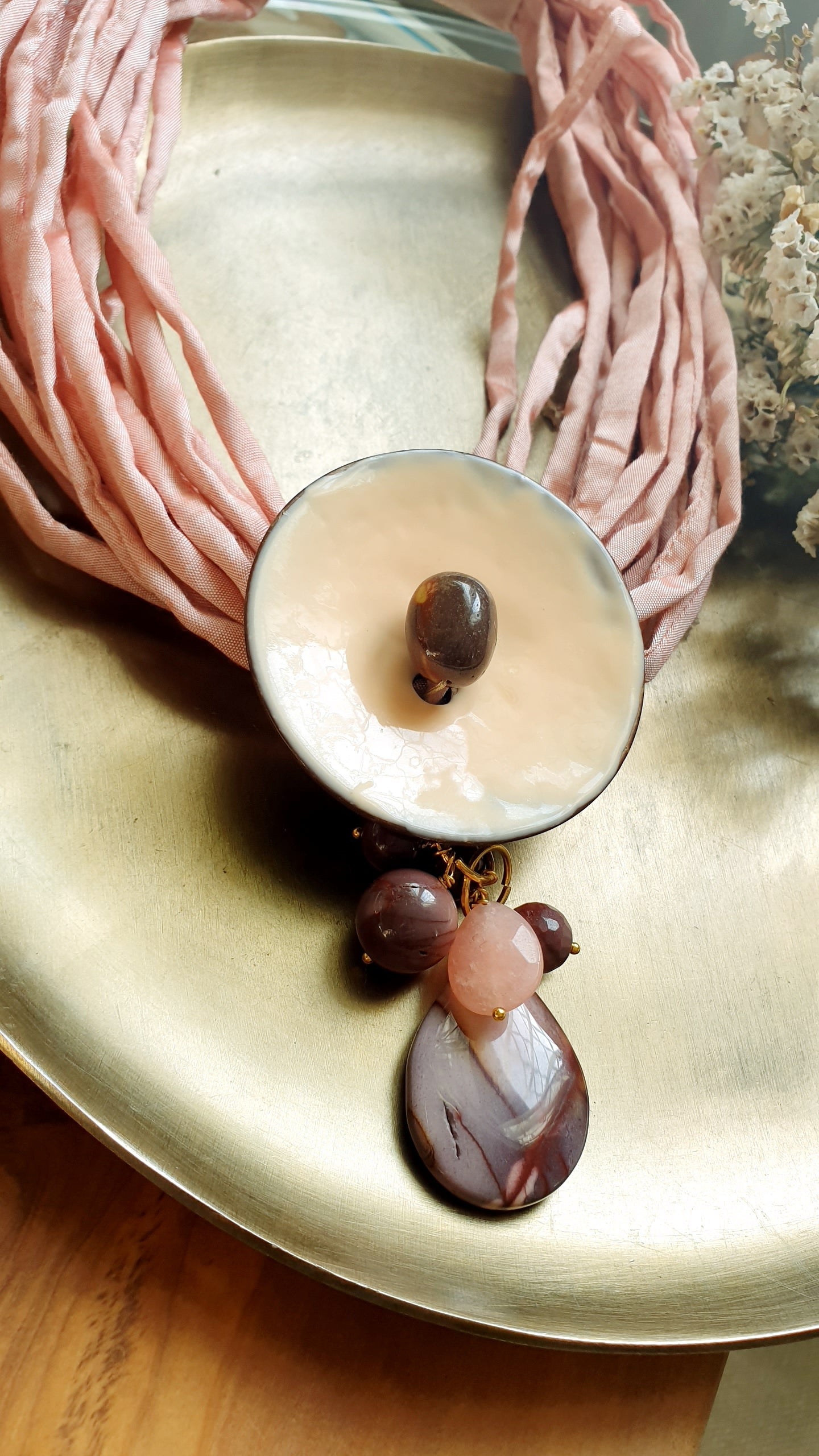 grappolo di pietre con grande goccia in mokaite cm. 3.5 x 2.5, goccia in quarzo rosa, sferein mokaite.