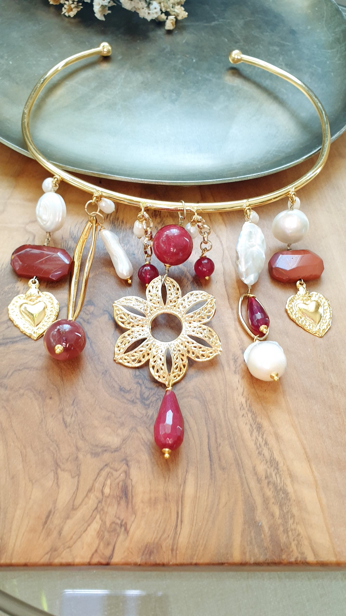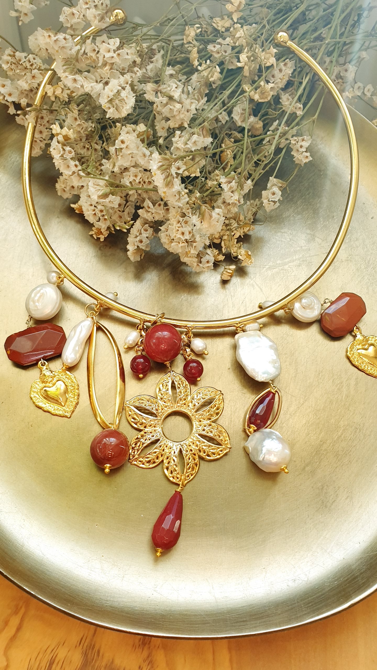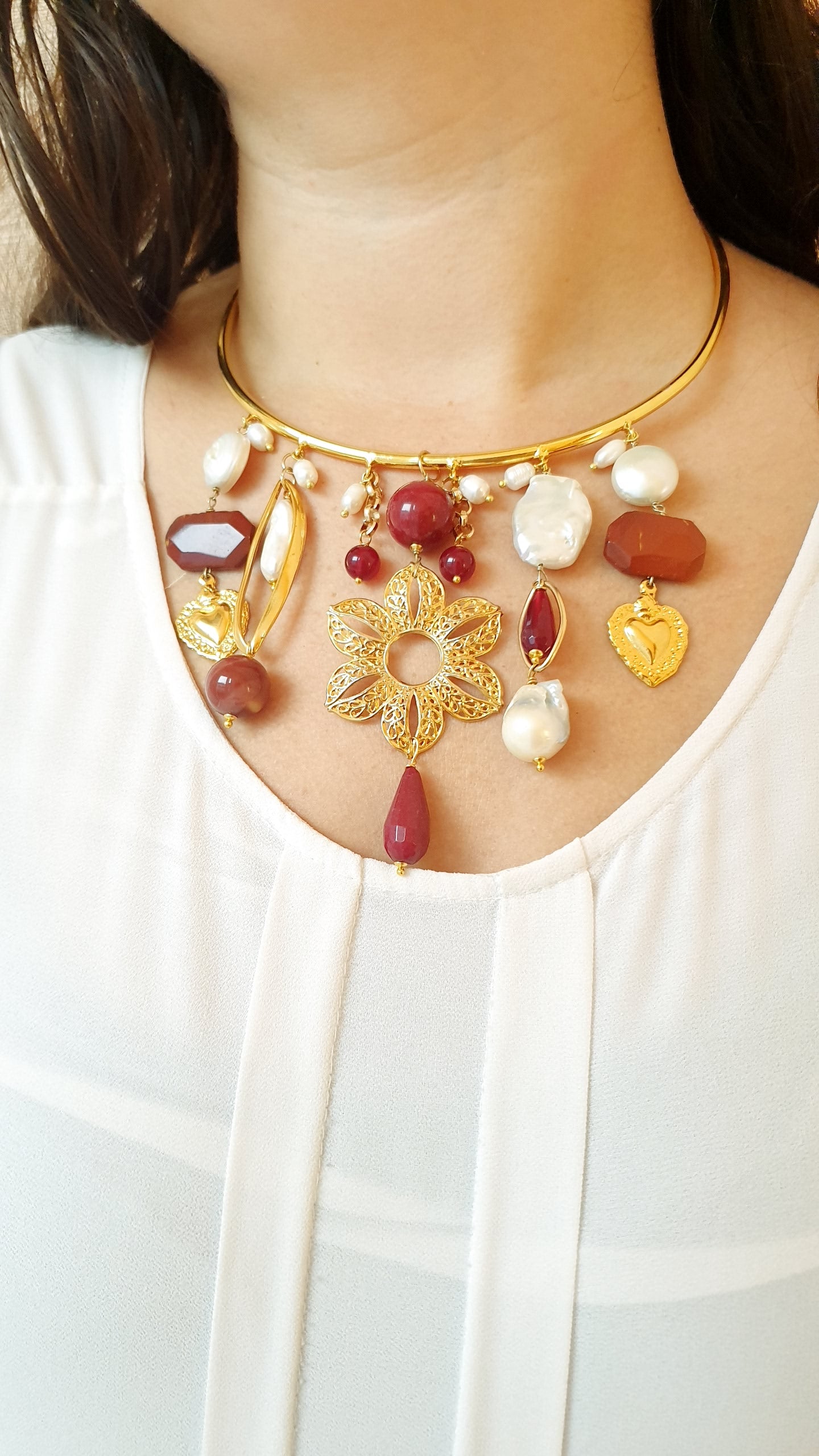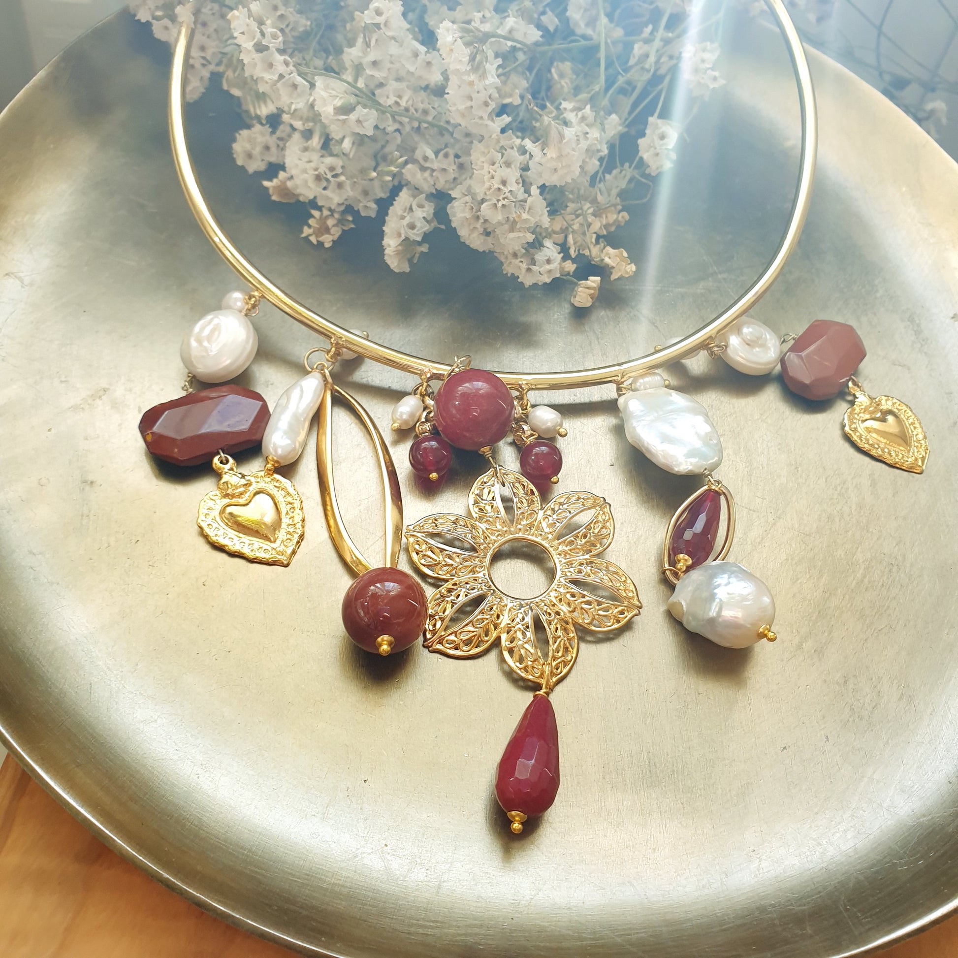 Collana artigianale realizzata con girocollo placcato oro con Mokaite, perle barocche, giada, inserti in ottone.