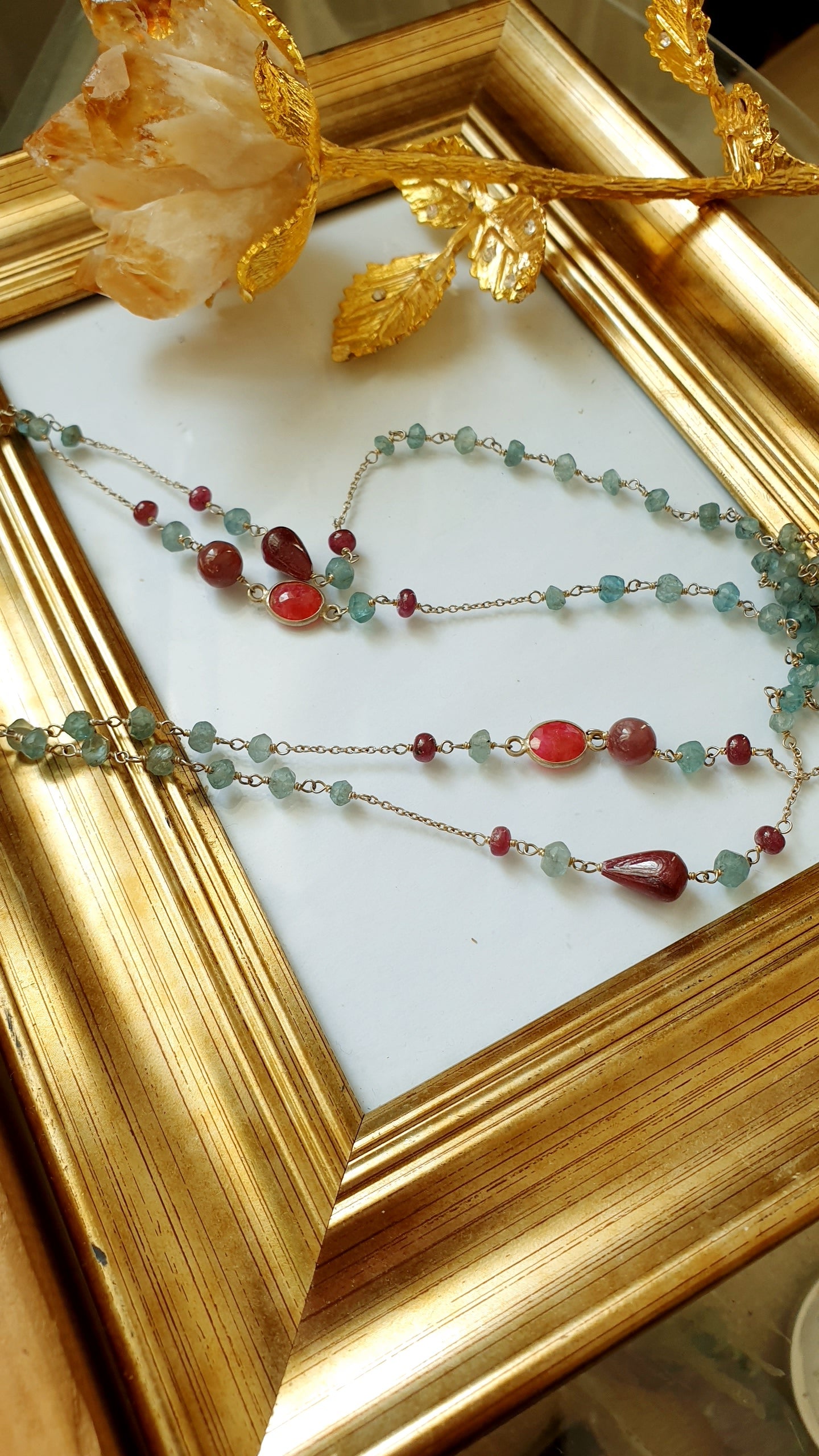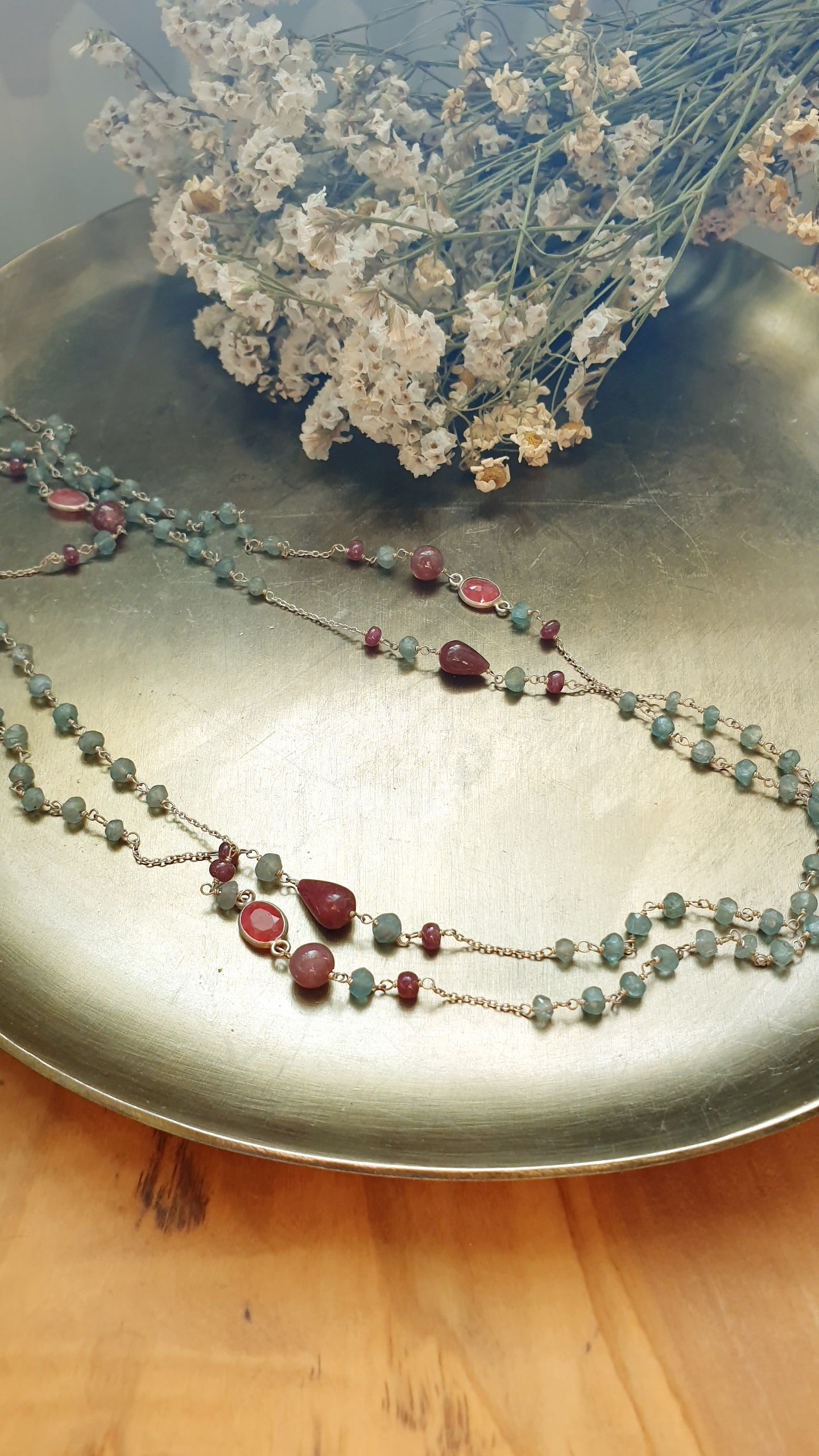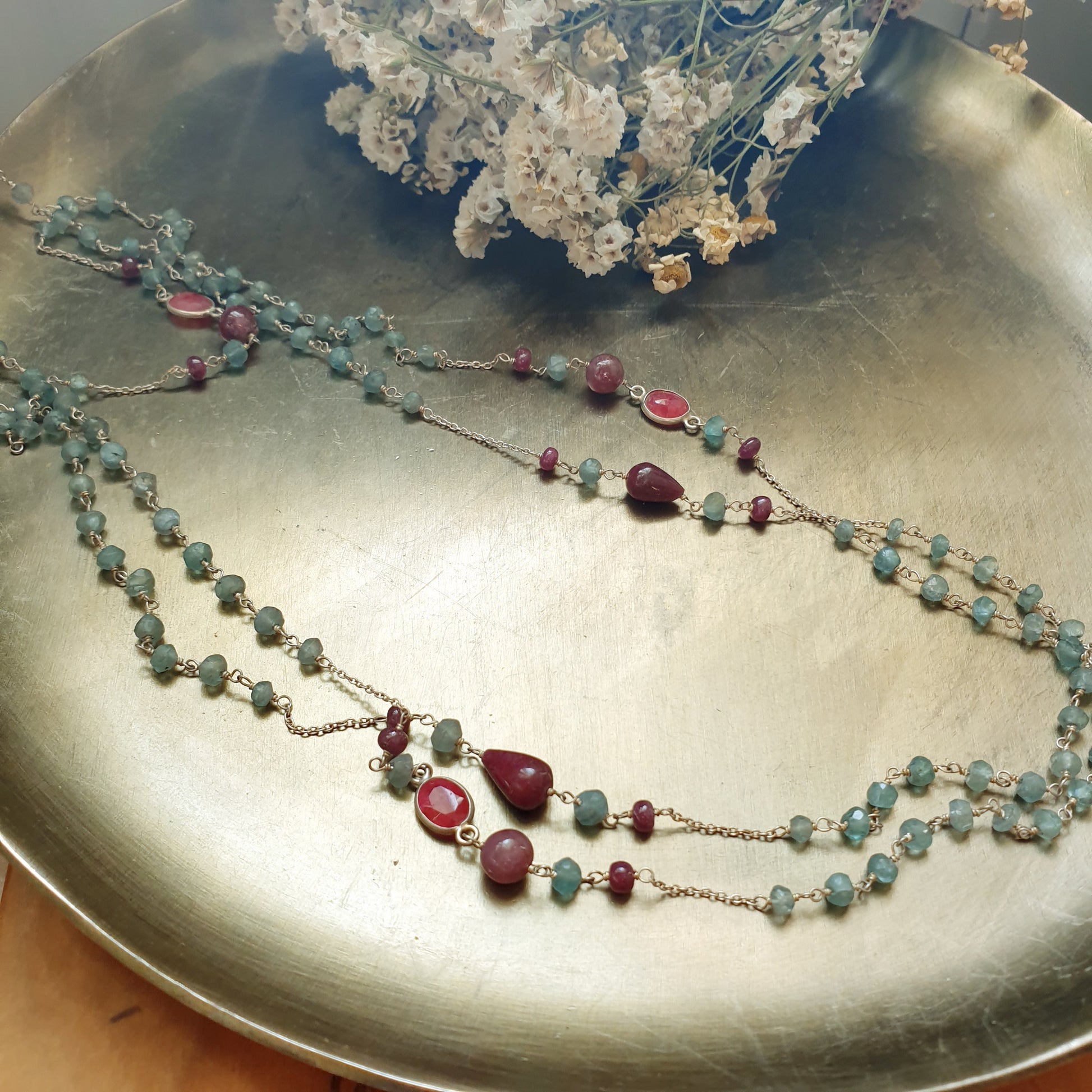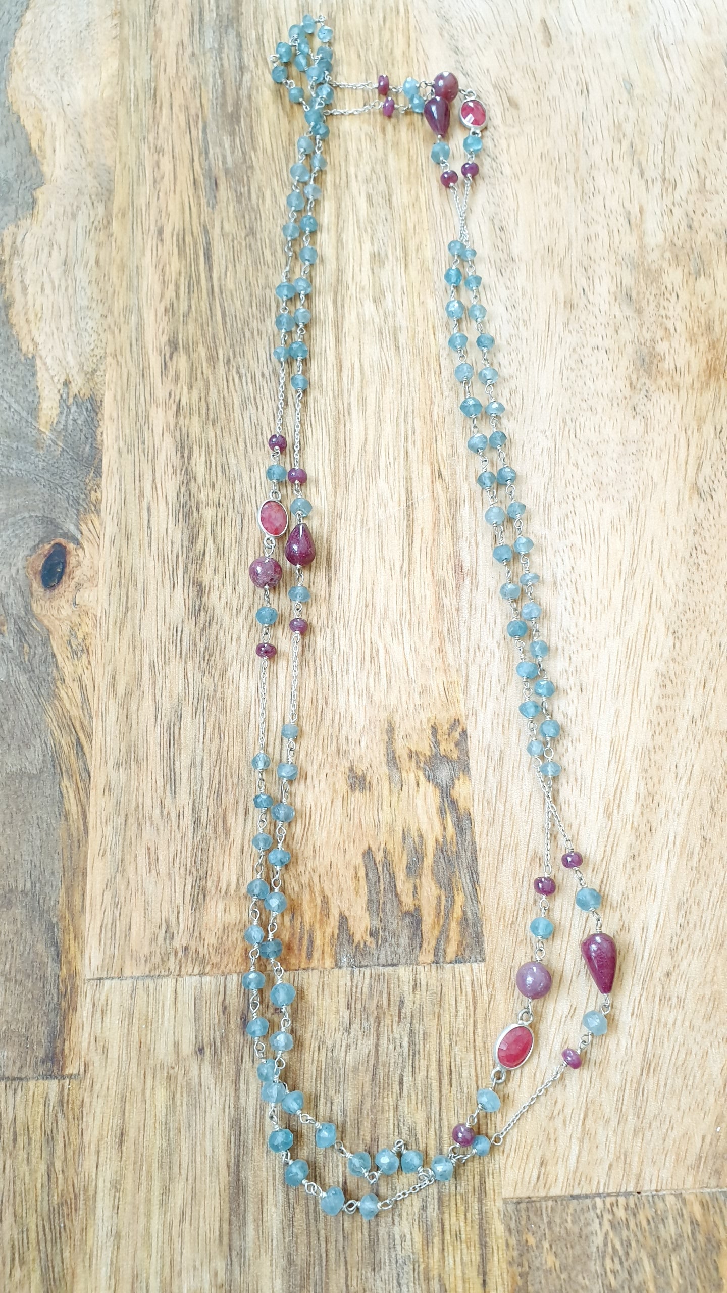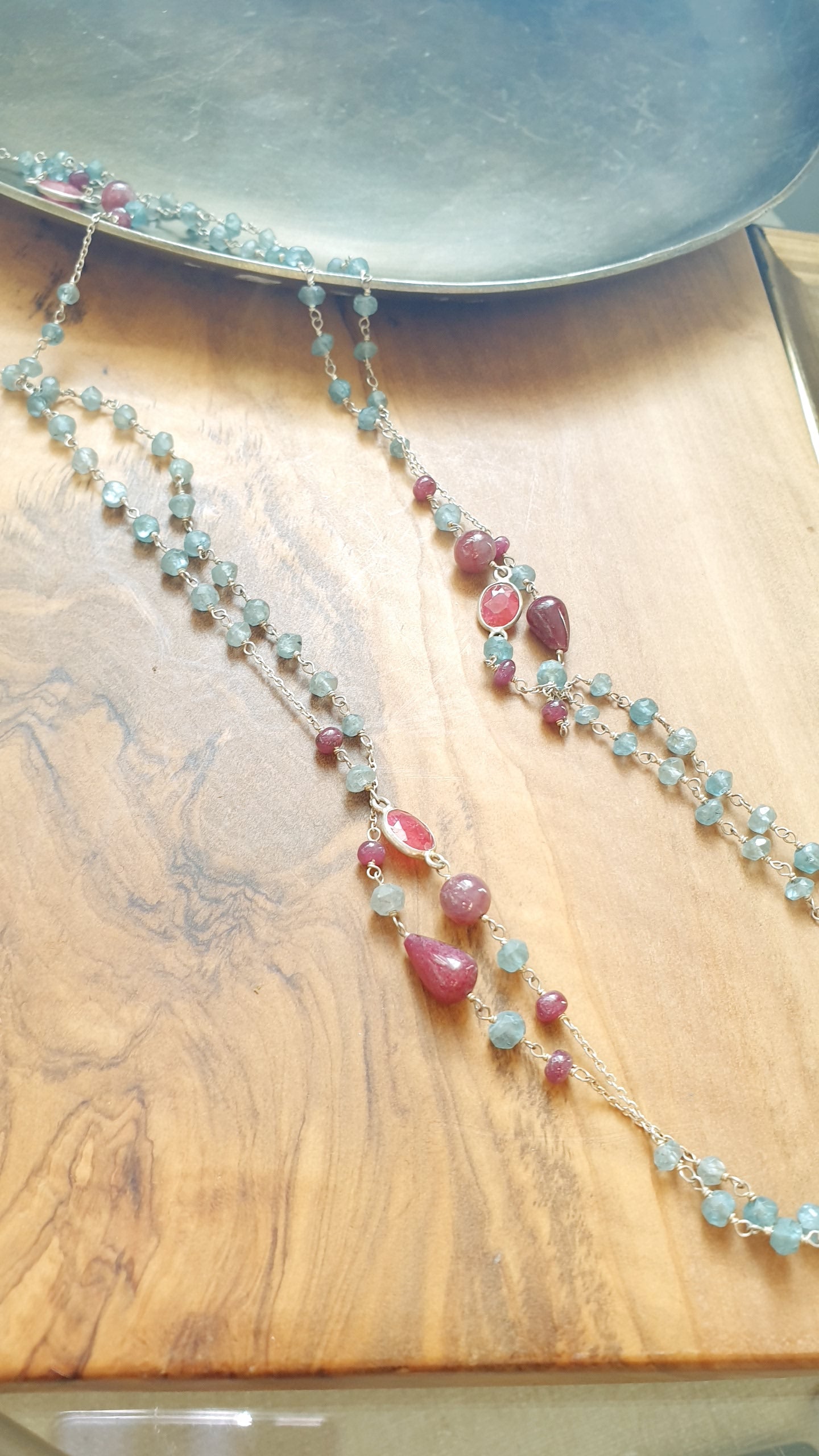 Lunga collana in argento 925 anallergico, montata a rosario con acquamarina e tormaline