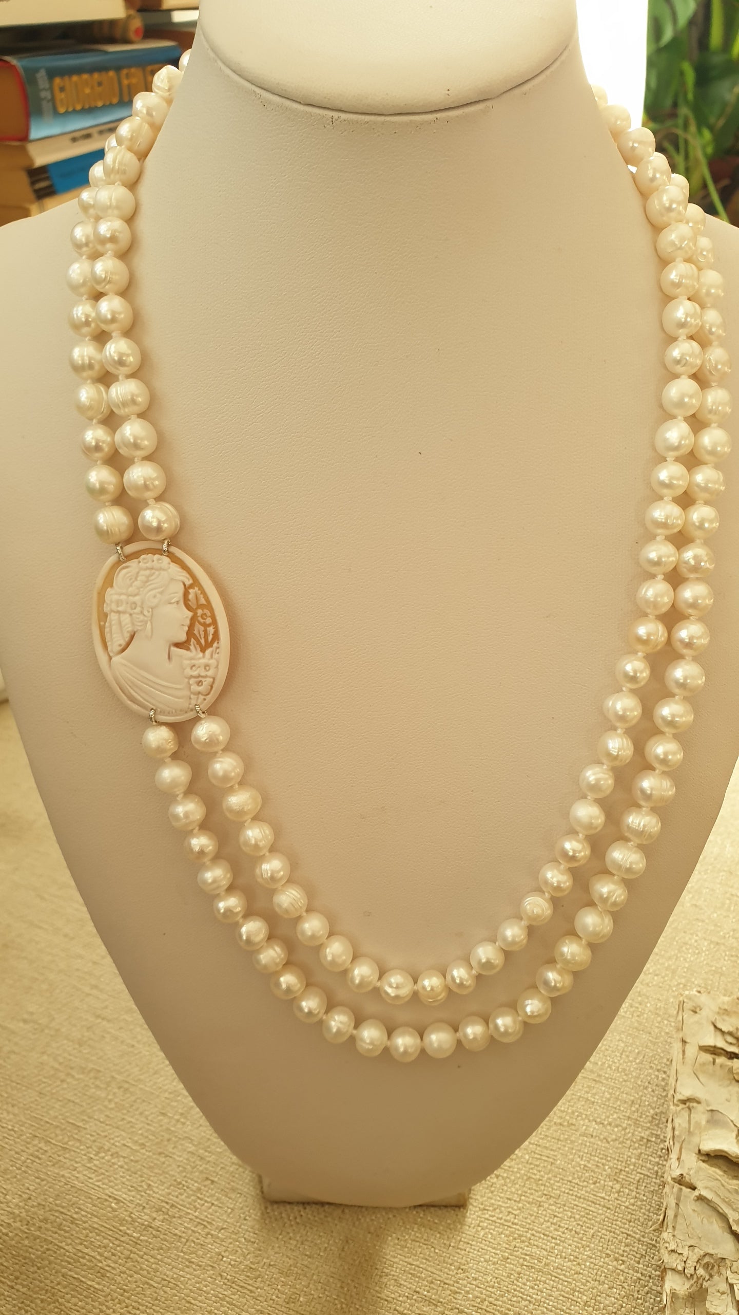 Collana artigianale realizzata in 2 fili di perle di fiume da mm. 8 con cammeo dama 4 x 3