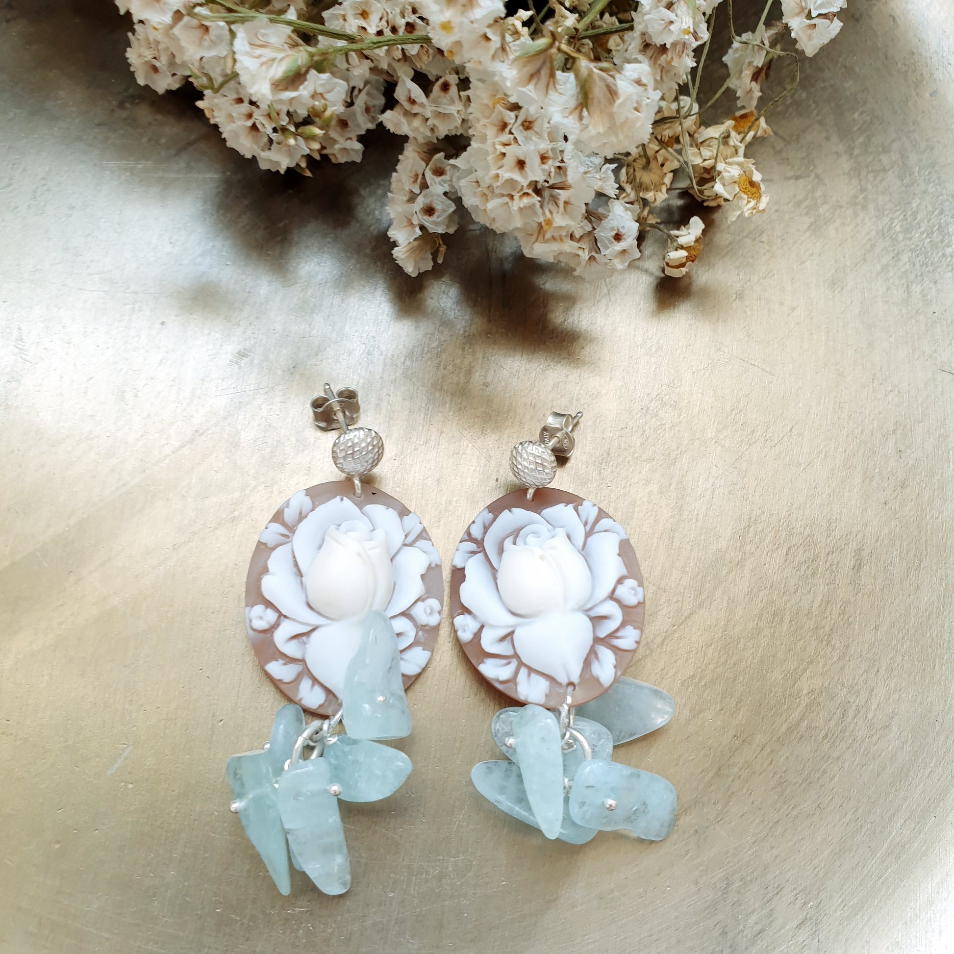 Grandi ncammei floreali incisi su conchiglia da Maestro di Torre del Greco cm. 3 x 2.5, grandi chips di acquamarina.
