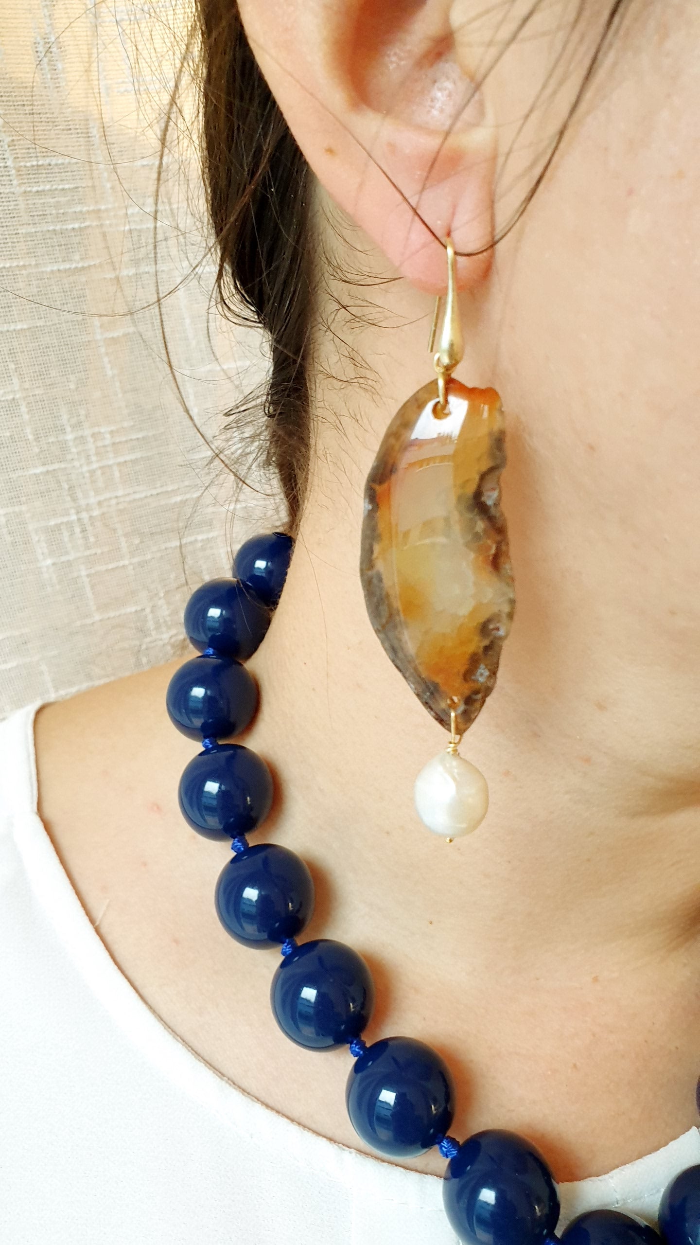 Grande agat marrone/miele cm. 5 x 2, occhio di S. Lucia cm. 2.5, quarzo citrino mm. 12, perle barocche cm. 1.5.