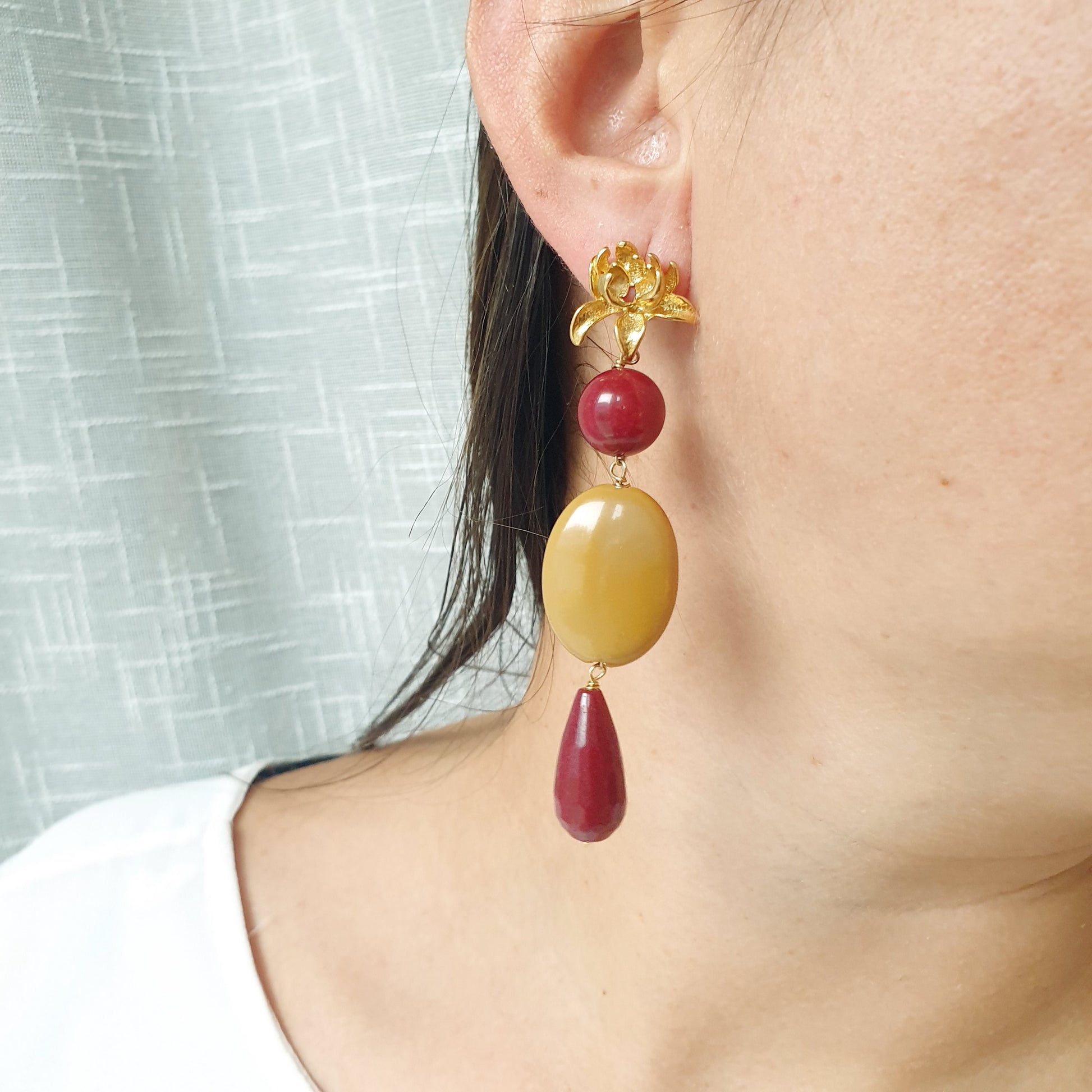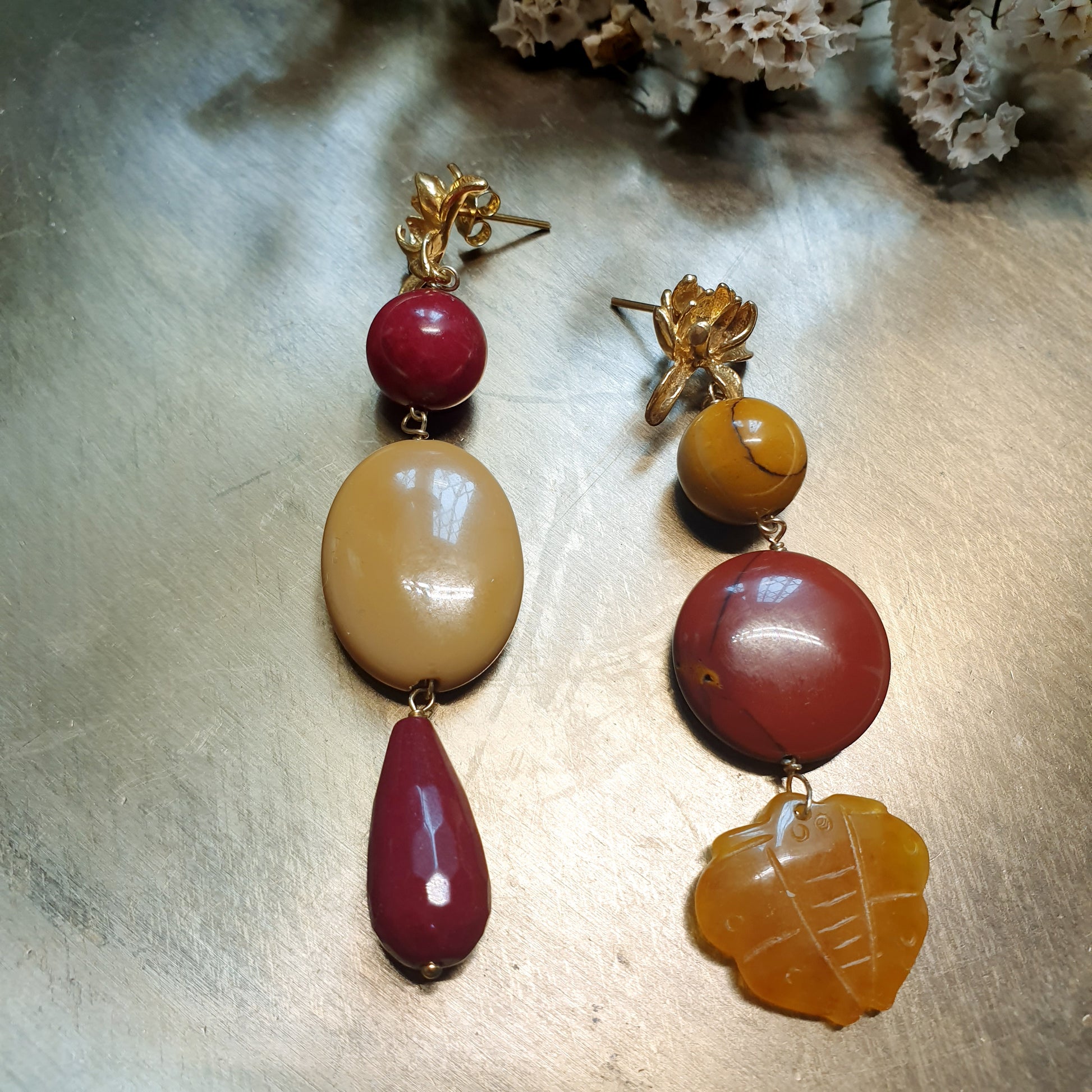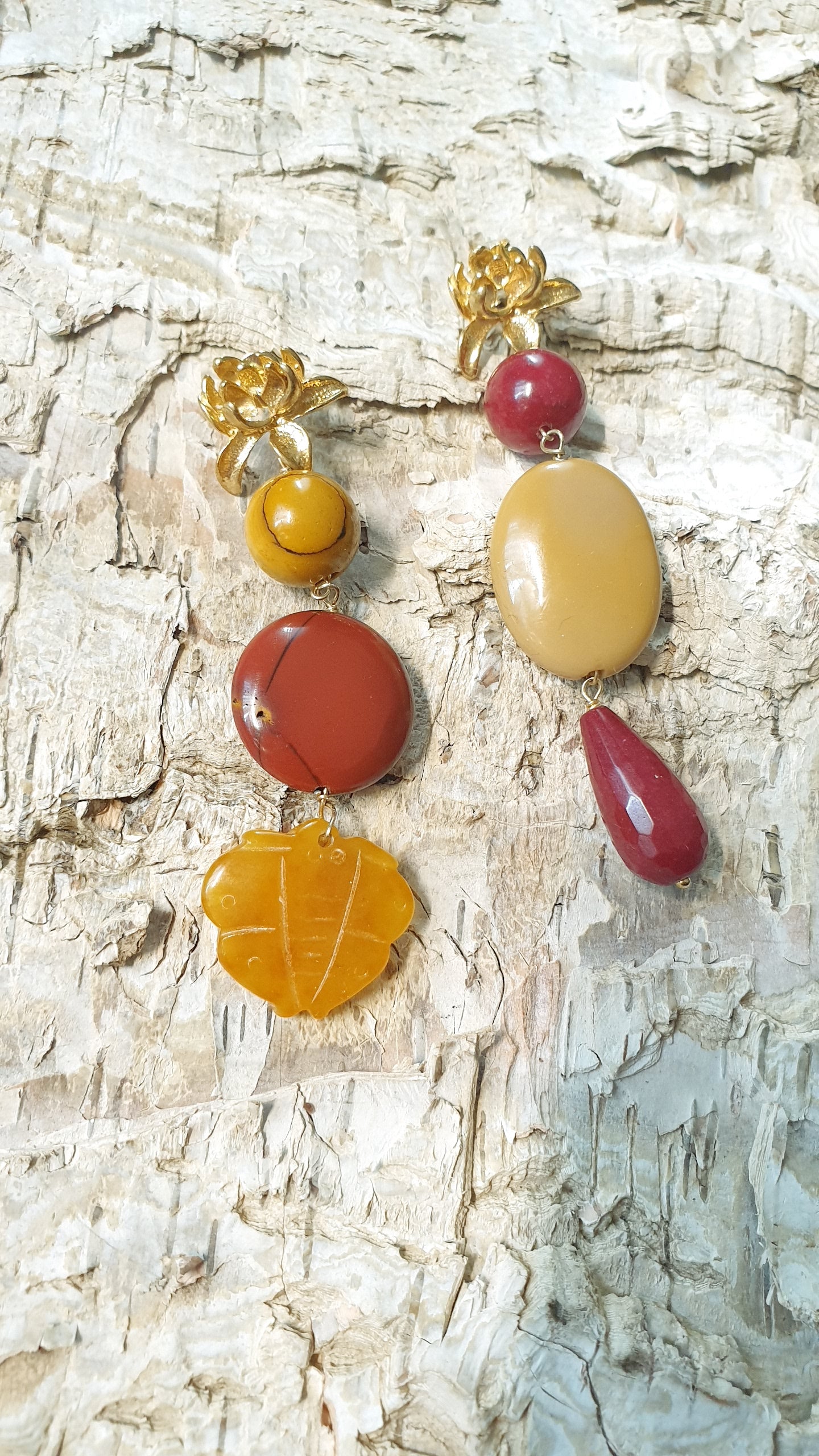 Vari pezzi di mokaite nei colori bordeaux e senape, fiore in giada
