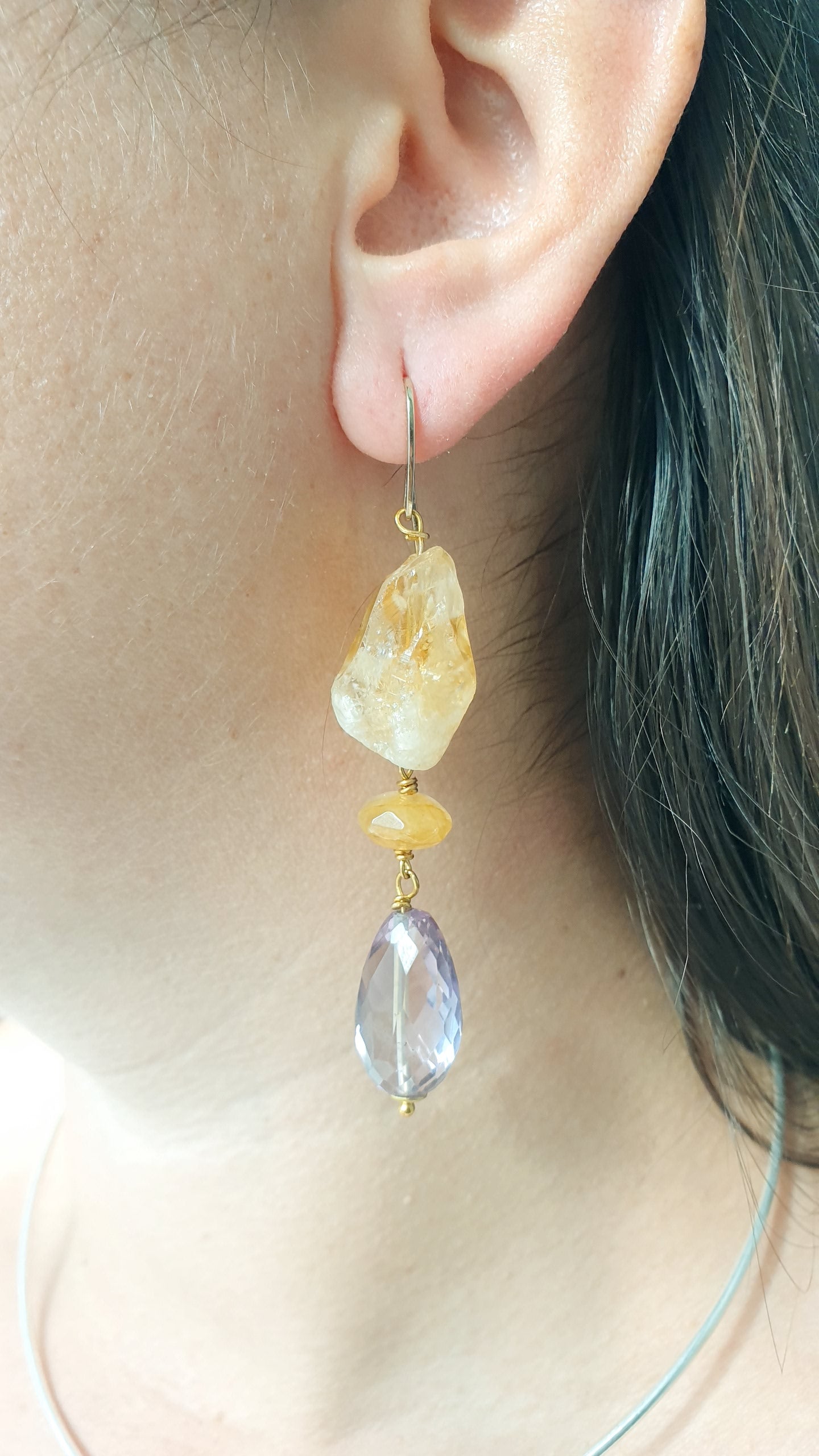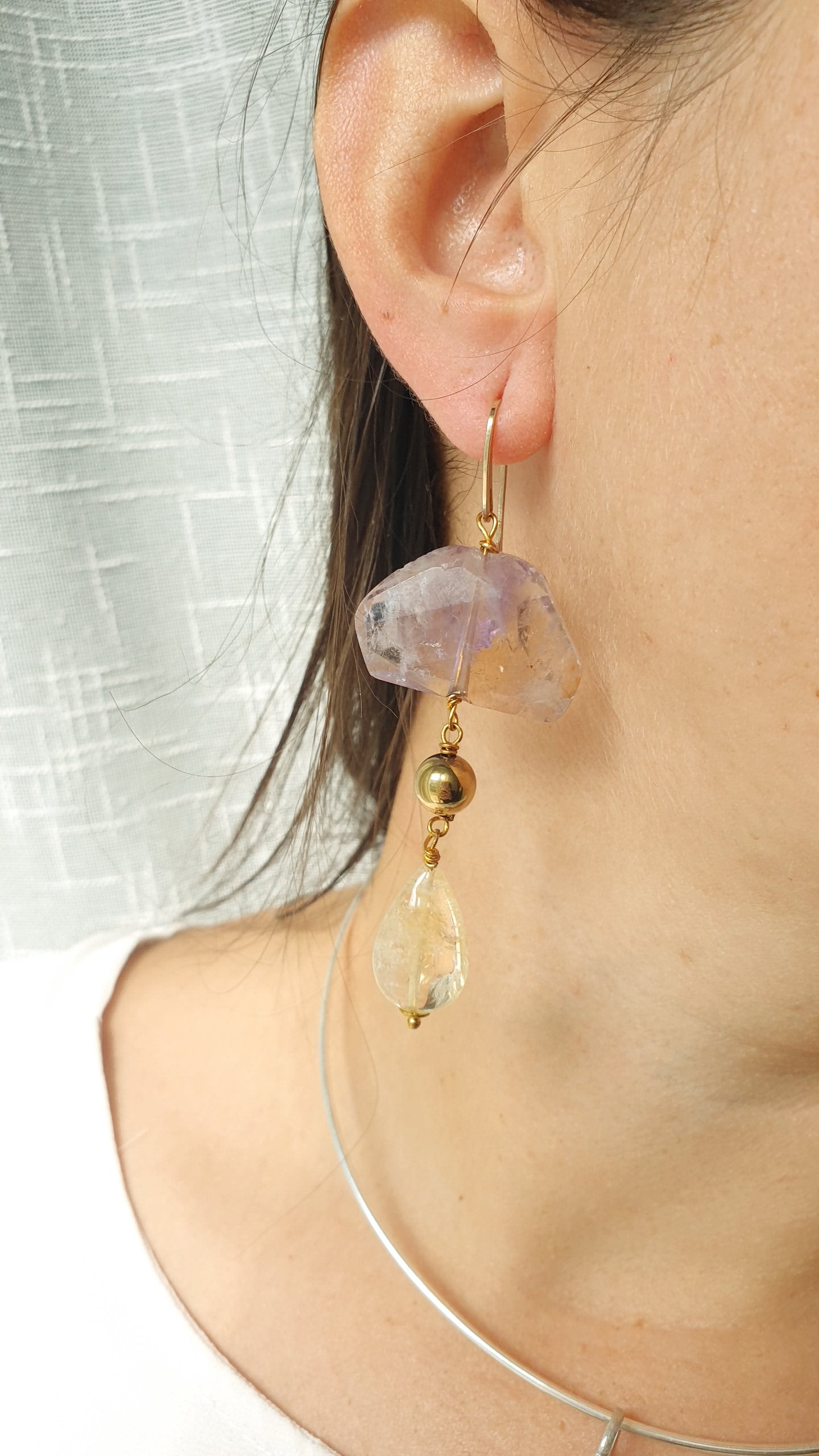 Quarzo ametrino (ametista più pregiata) cm 2.5 x 2, goccia in quarzo ametrino sfaccettato cm. 2 x 1, Quarzo citrino grezzo cm. 2 x 1.5, goccia in citrino cm. 2 x 1.