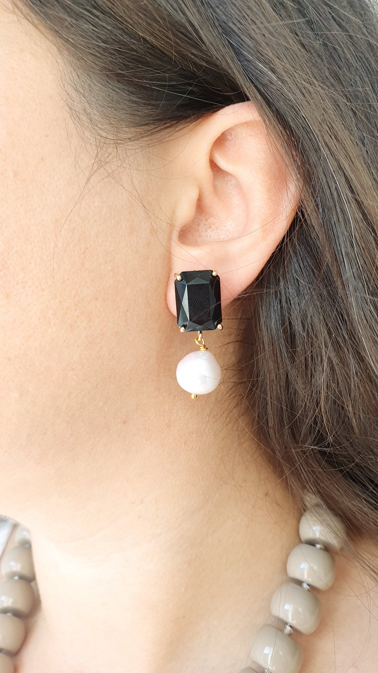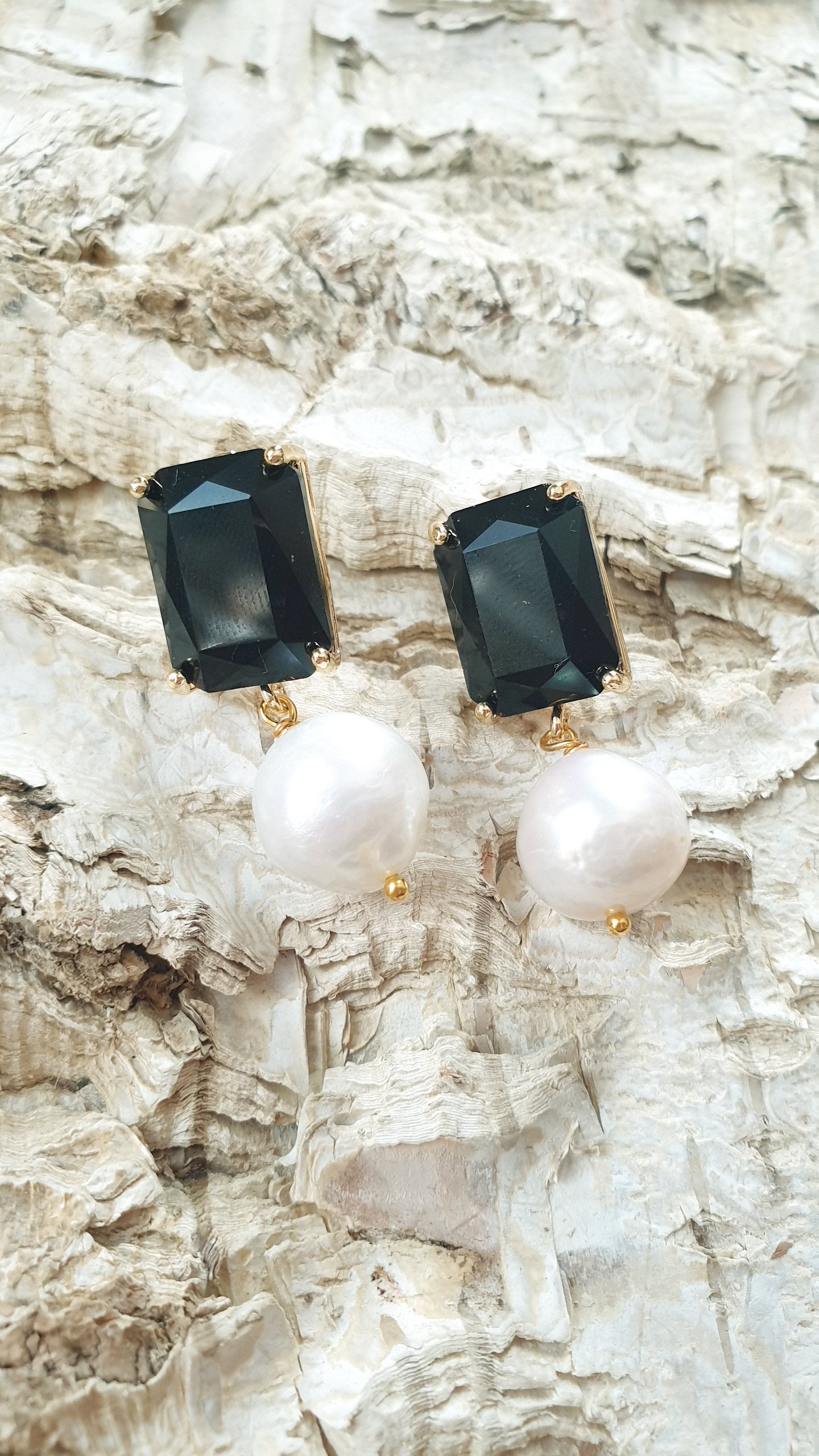 Orecchini artigianali realizzati con gancio a perno in ottone e occhio di gatto nero, perle barocche mm. 12.